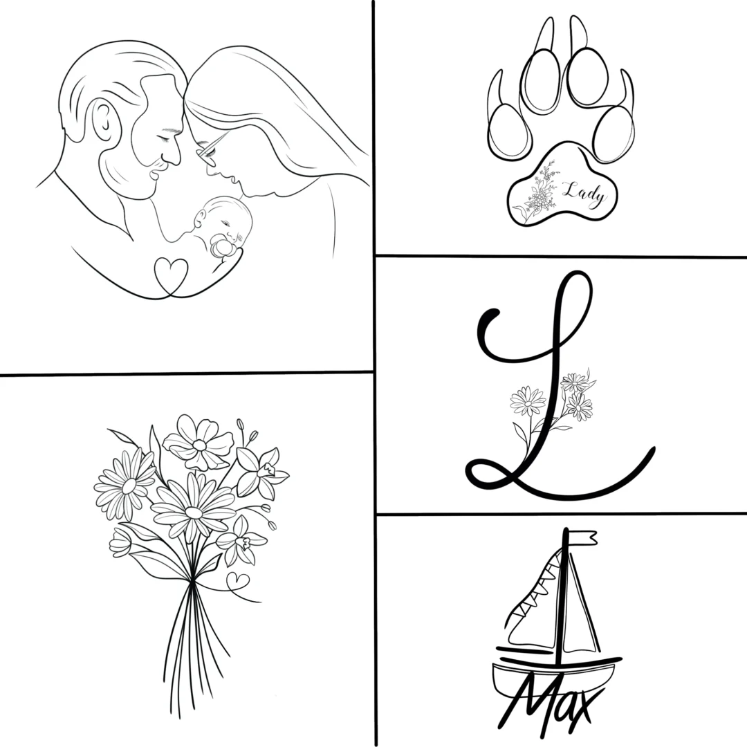 Denk aan een minimalistische tekening van een handje of voetje, een geboortebloem, sterrenbeeld, initialen met naam of zelfs een stukje handgeschreven tekst. Elk ontwerp is een pure vertaling van liefde, herinnering en verbinding.