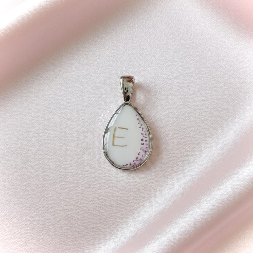 - Herinneringsjuweel met haarlokje in letter E en paarse bladmetaal vlokjes